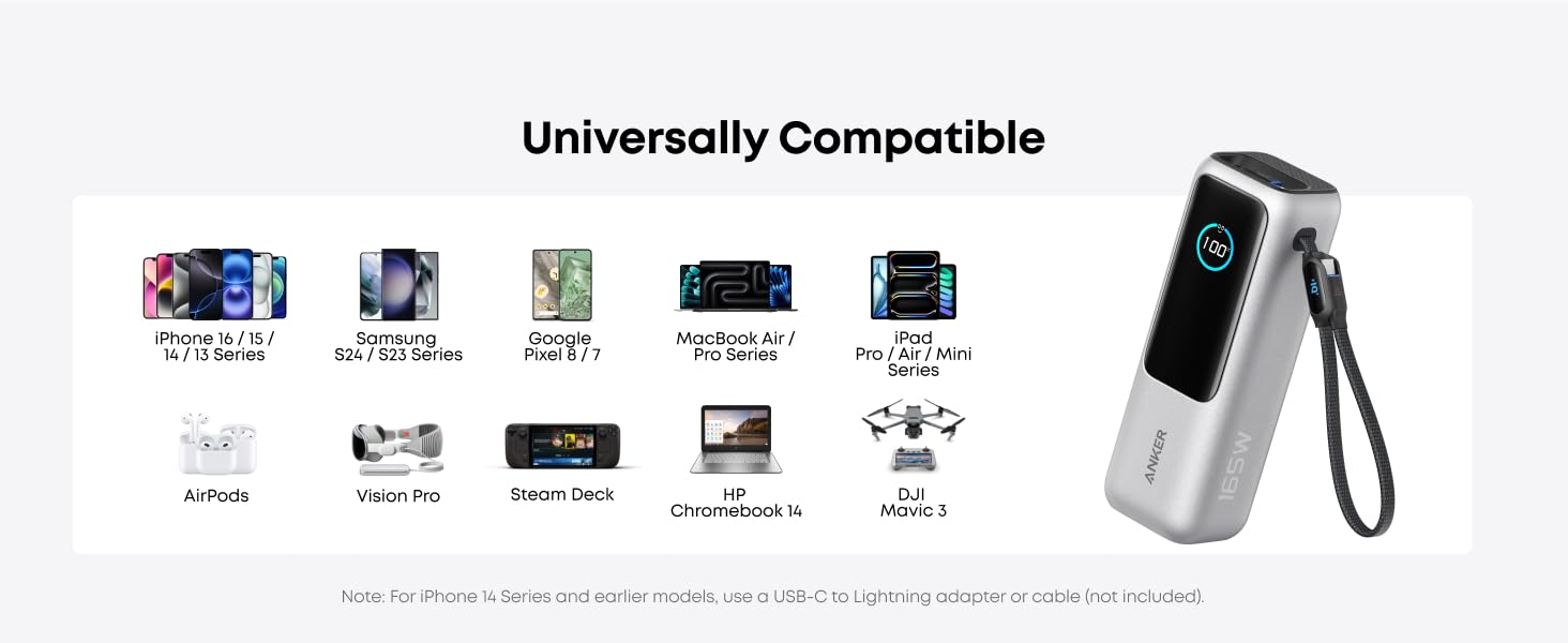 - Lo que obtienes: banco de energía Anker (25 K, 165 W, cables integrados y retráctiles), bolsa protectora, manual de usuario (idioma español no garantizado).