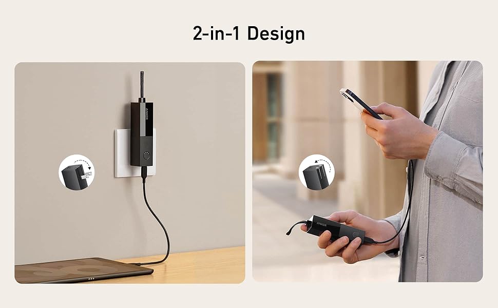 • En casa y fuera: cuando la batería está baja, cargue su dispositivo desde un tomacorriente de pared o sobre la marcha con el cargador portátil incorporado.