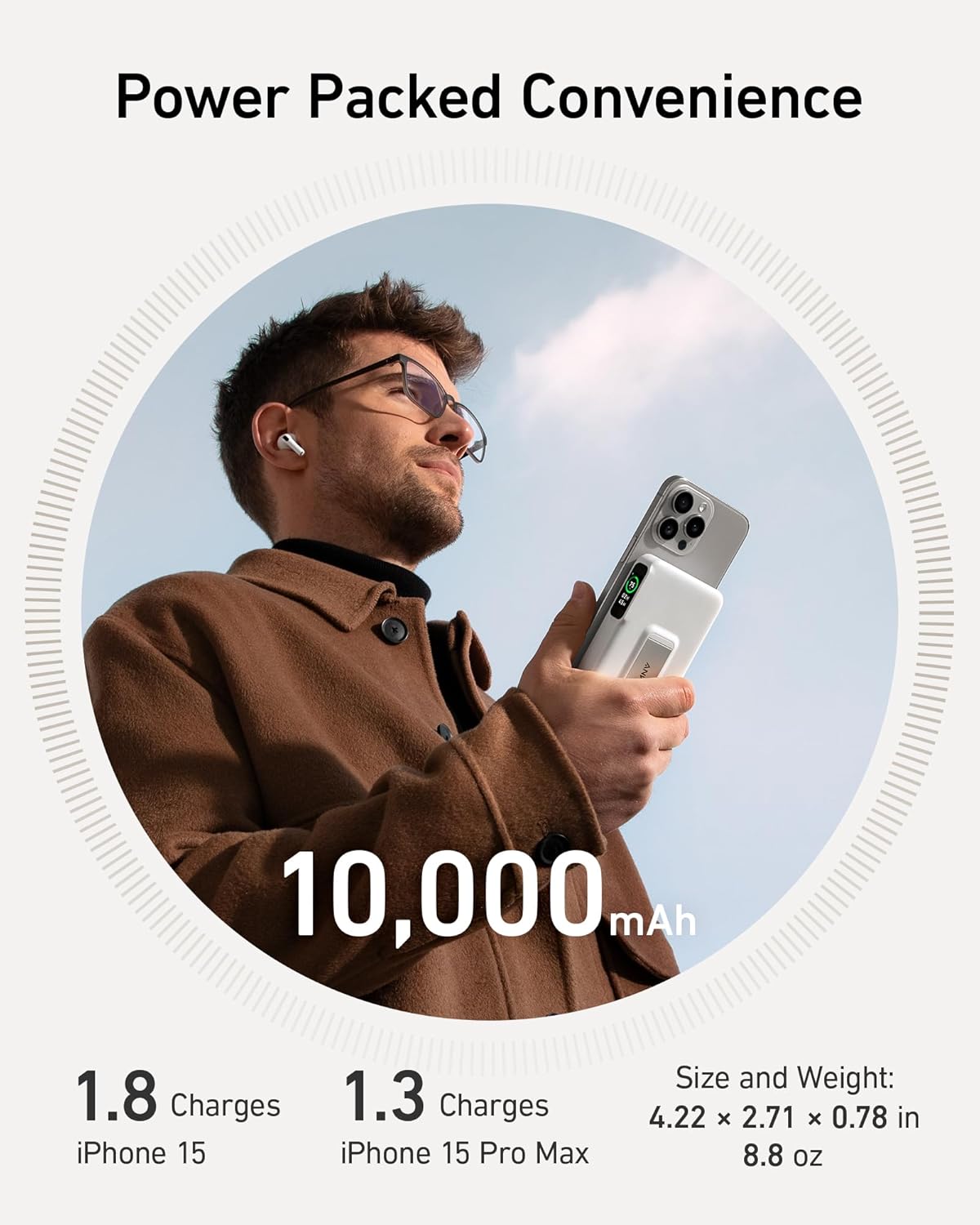 - Encienda y apuntale: con un potente 10,000 mAh, asegure 1.8 cargas para su iPhone 15 Pro y disfrute de la visualización manos libres con el soporte incorporado.
