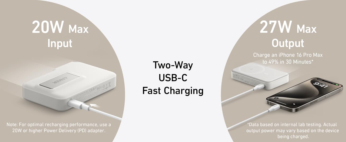 - Nota de compatibilidad: Este banco de energía está optimizado para la serie iPhone 12/13/14/15 con capacidades de carga rápida magnética de 15W. Si bien puede cargar dispositivos Android como teléfonos Samsung y Google, no admitirán la función magnética ni alcanzarán la velocidad de carga inalámbrica de 15 W, y se cargarán con una eficiencia menor.
