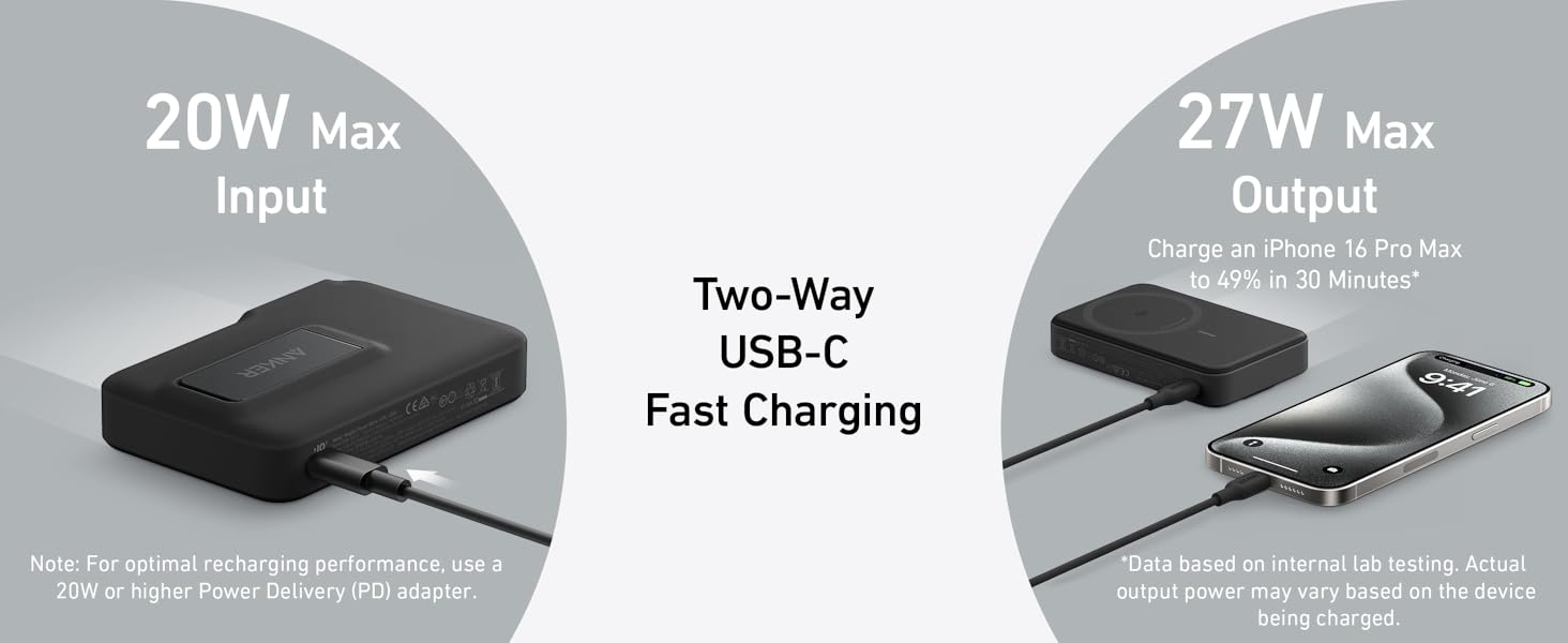 - Nota de compatibilidad: Este banco de energía está optimizado para la serie iPhone 12/13/14/15 con capacidades de carga rápida magnética de 15W. Si bien puede cargar dispositivos Android como teléfonos Samsung y Google, no admitirán la función magnética ni alcanzarán la velocidad de carga inalámbrica de 15 W, y se cargarán con una eficiencia menor.