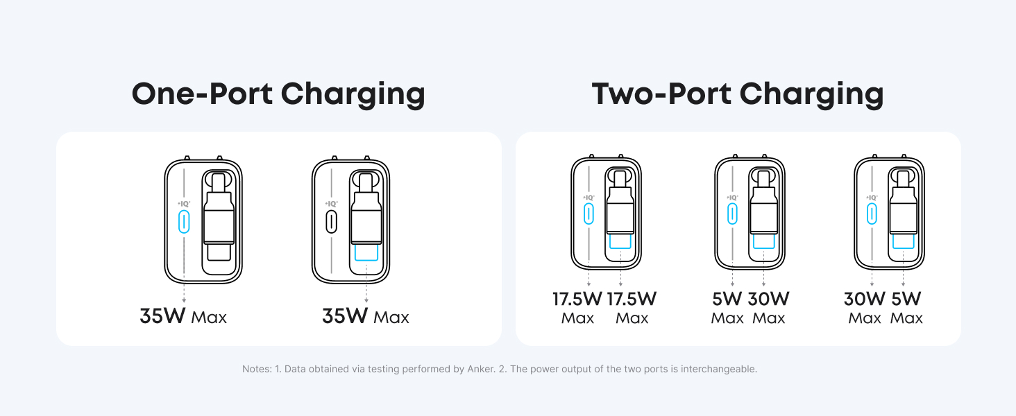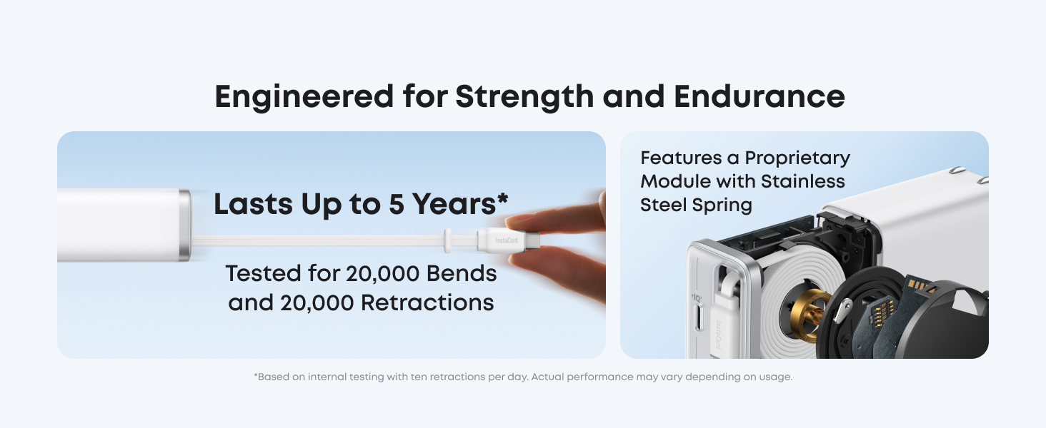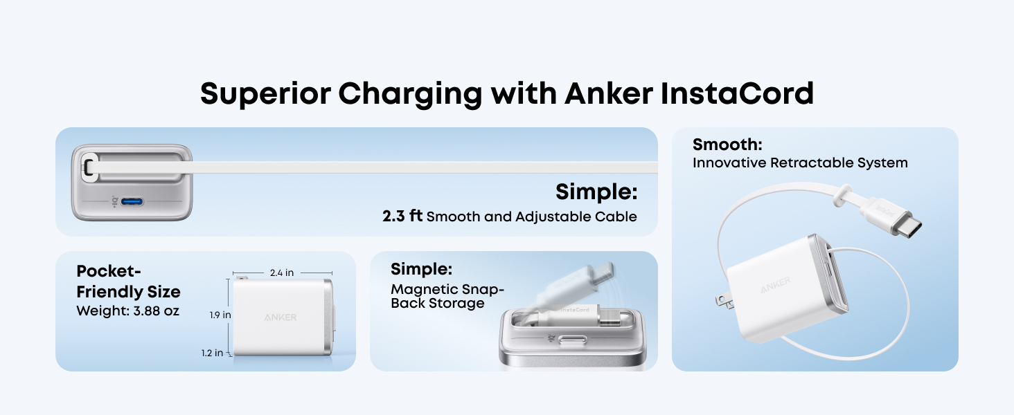 - Tire para mayor potencia y comodidad: El cargador avanzado incorpora el cable patentado Anker InstaCord, construido para soportar 20,000 dobleces y 20,000 retracciones para una durabilidad prolongada. El cable ajustable se extiende hasta 2.3 pies, ofreciendo flexibilidad para adaptarse a varios escenarios de carga. (Nota: Datos basados en pruebas internas. El rendimiento real puede variar dependiendo de las condiciones de uso específicas.)