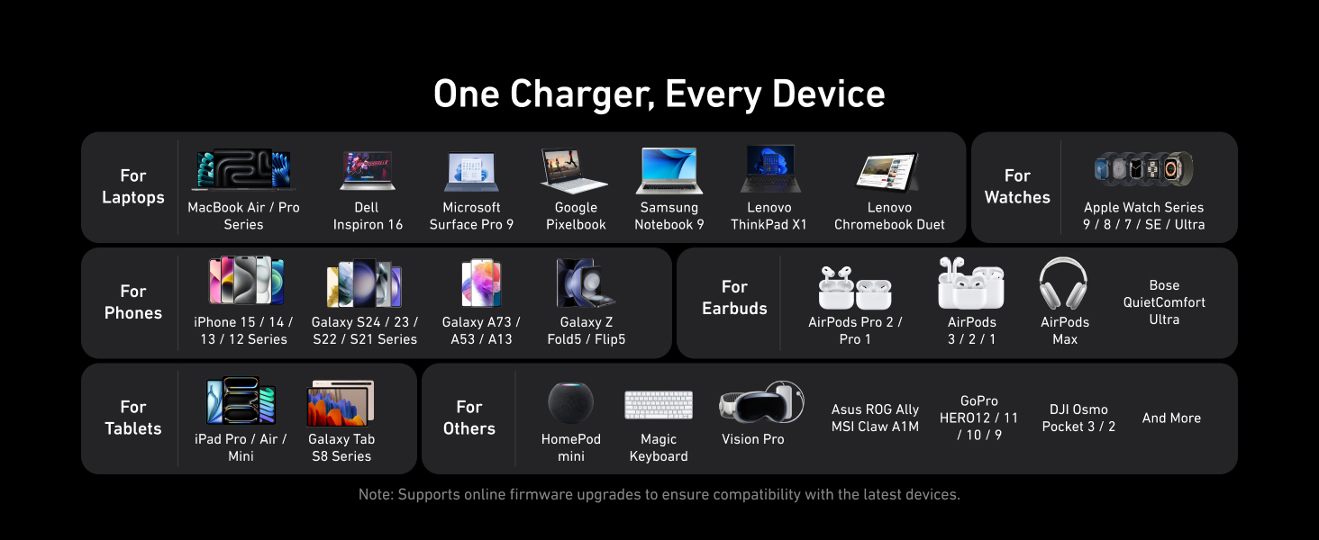 - Debido a protocolos de carga propietarios, algunos dispositivos como Surface Laptop Studio 2, Dell XPS 15 (9500/9510), Dell Alienware X14 y Dell Mobile Precision 5570 no pueden cargarse a máxima velocidad.