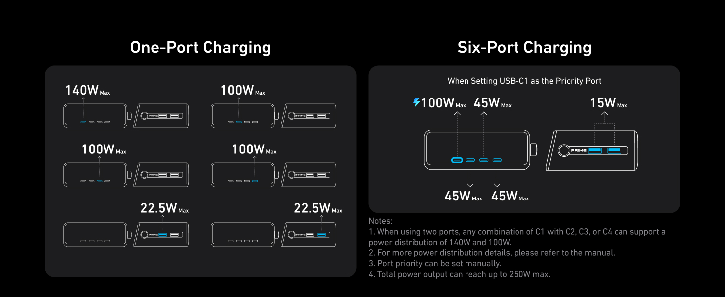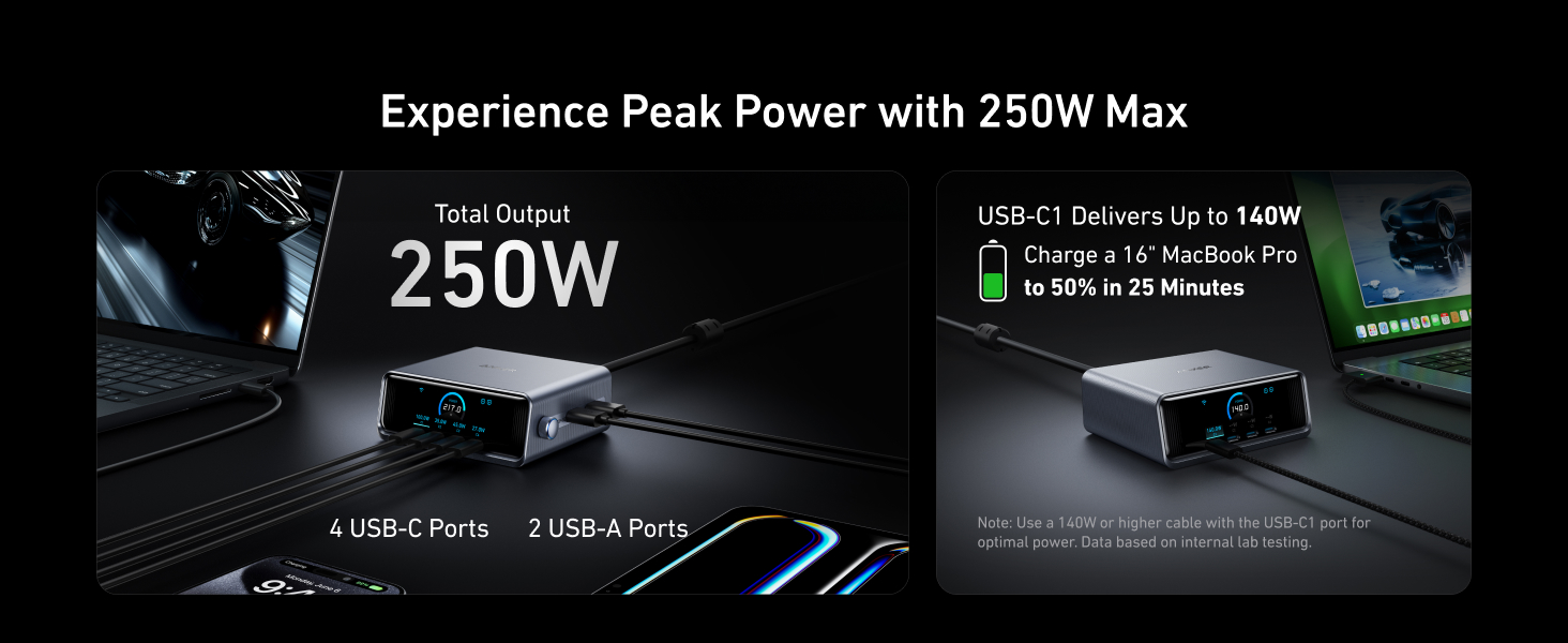 - Salida súper rápida de 250 W: experimente la comodidad de la carga de alta capacidad con este cargador de escritorio de 250 W, con cuatro puertos USB-C y dos USB-A para alimentar sus elementos esenciales simultáneamente.