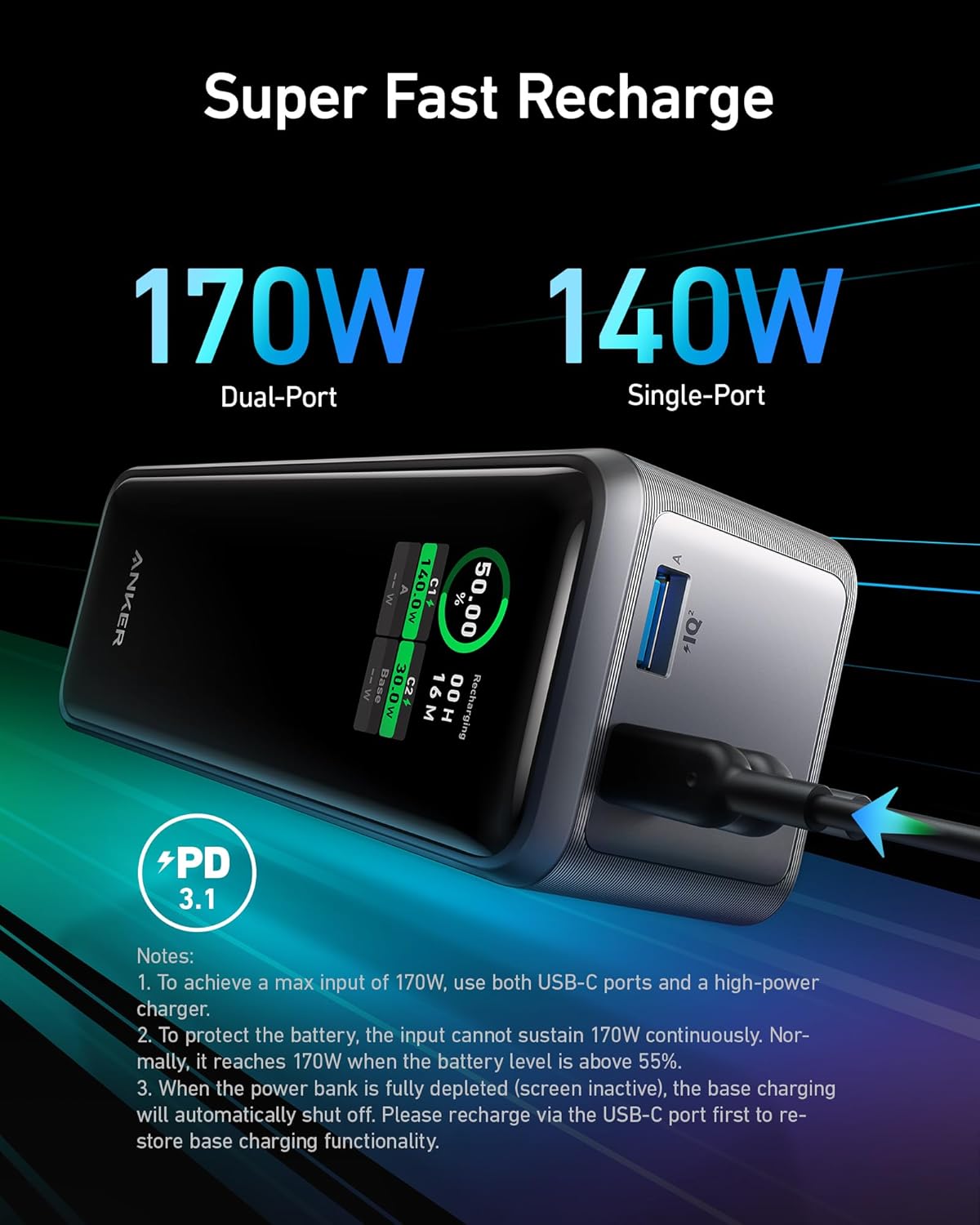 El poder de Anker Prime: Este power bank combina potencia ultra compacta, velocidad máxima de carga en cada puerto, el avanzado sistema de seguridad ActiveShield 2.0, compatibilidad sin igual y tecnología Power Delivery 3.1, garantizando una carga eficiente y segura para todos tus dispositivos.
