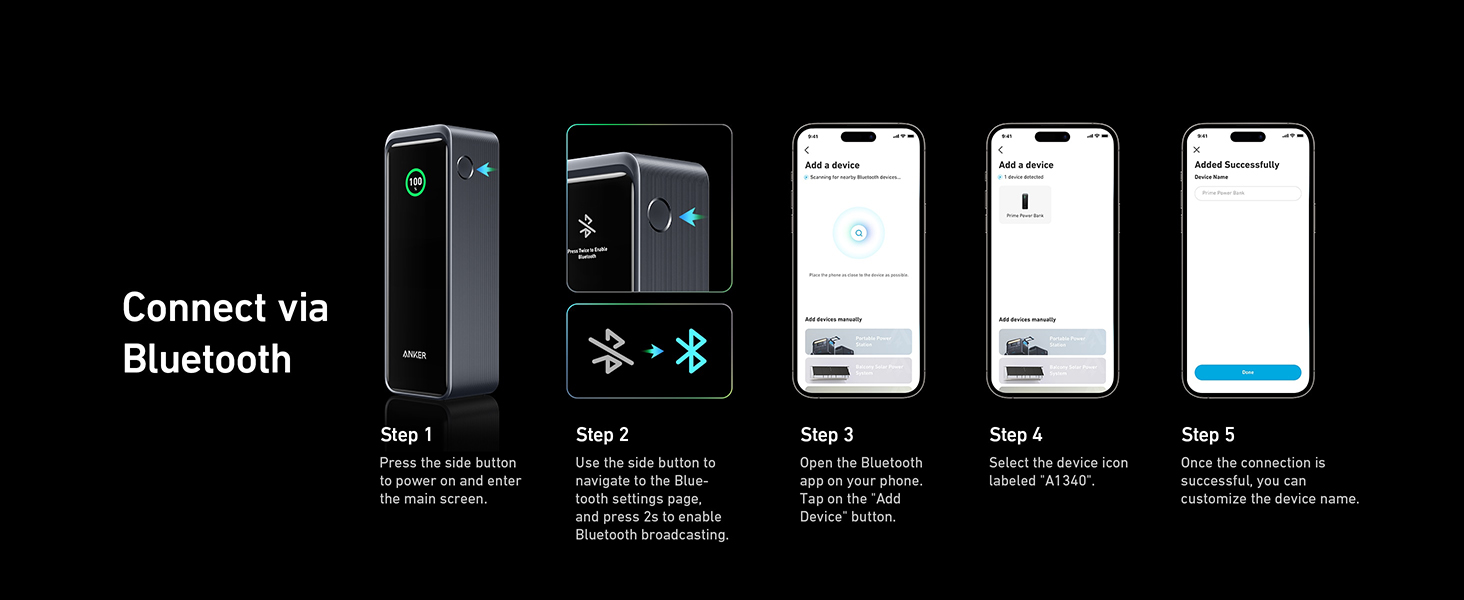 - Para garantizar un funcionamiento adecuado, mantente a una distancia máxima de 33 pies (10 m) del power bank al usar la app, ya que se conecta vía Bluetooth.