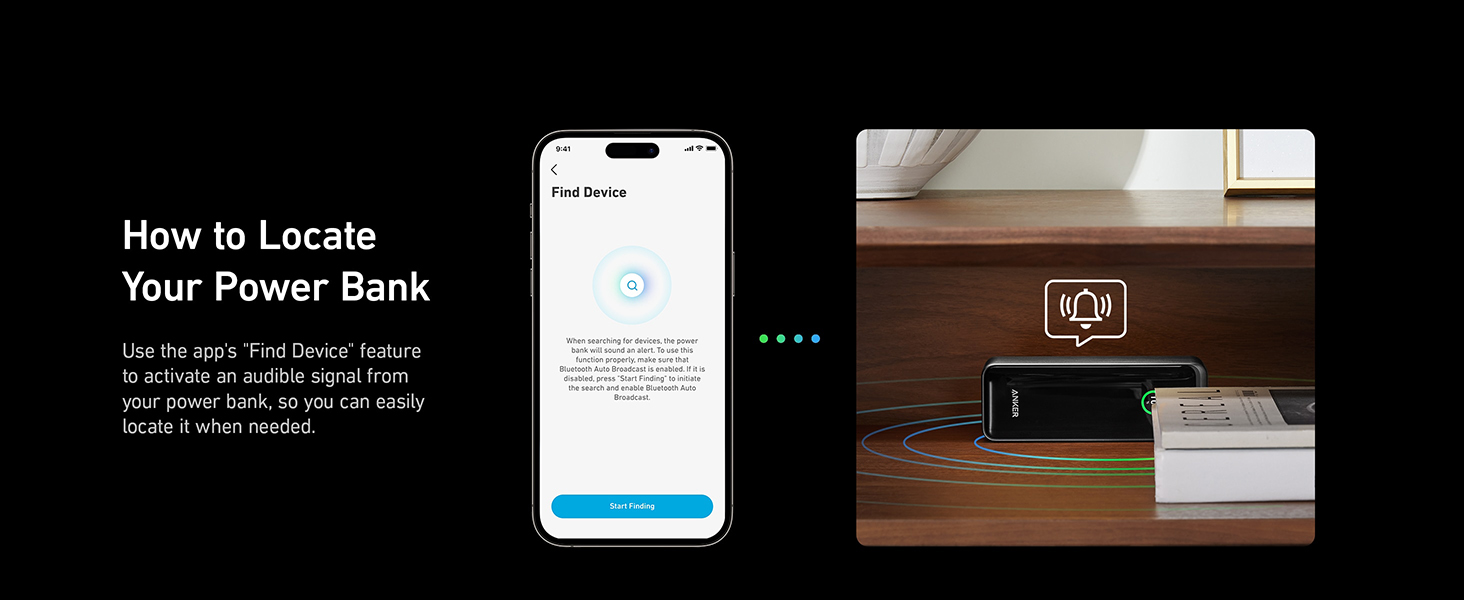 Localiza fácilmente tu power bank con alertas de sonido, monitorea estadísticas en tiempo real y utiliza carga inteligente para extender la vida útil de tus dispositivos.