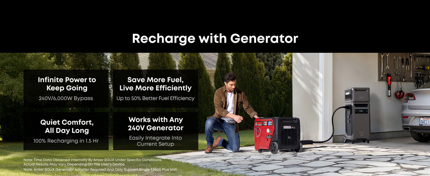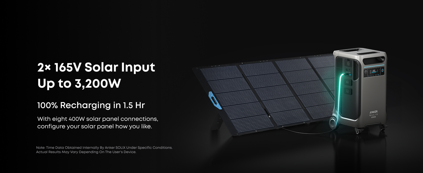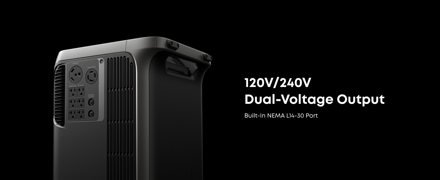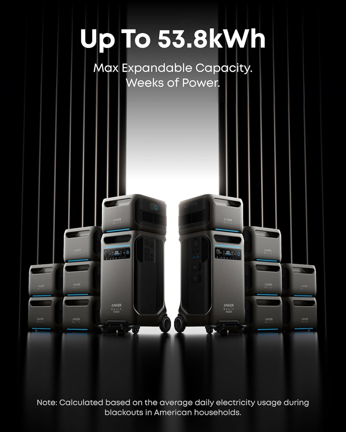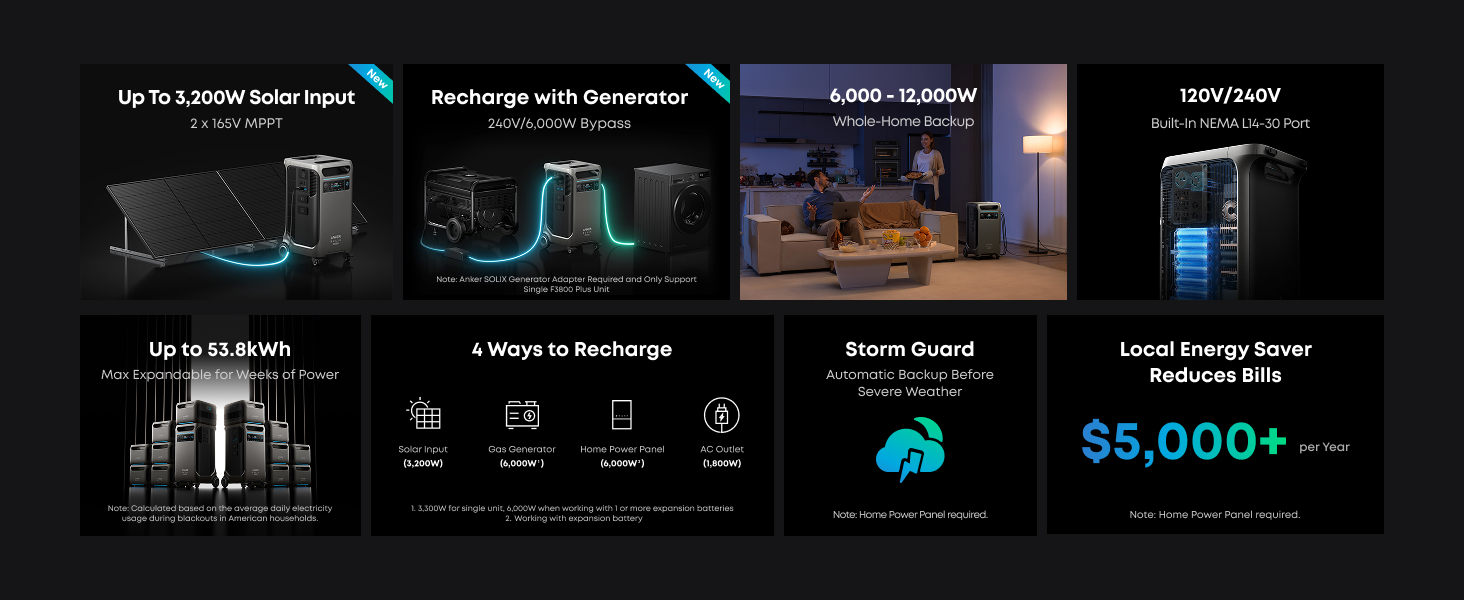 • Doble voltaje para cualquier electrodoméstico: no más limitaciones cuando está alimentando su secadora. La salida de CA de 120V/240V y 6.000W funciona todo en casa. Para más potencia, añade otro Anker SOLIX F3800 Plus para una salida de CA máxima de 12,000 W.