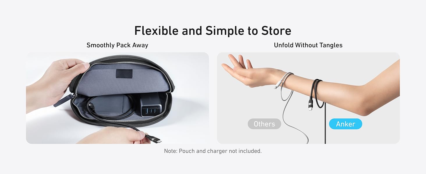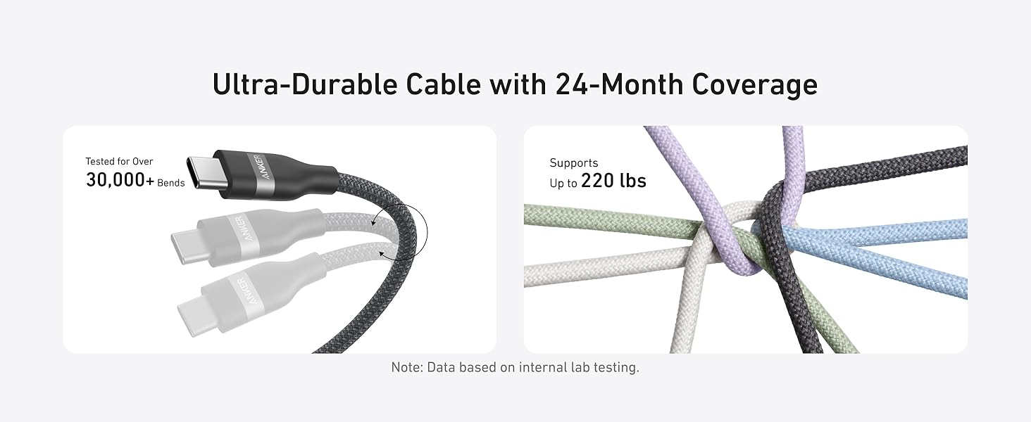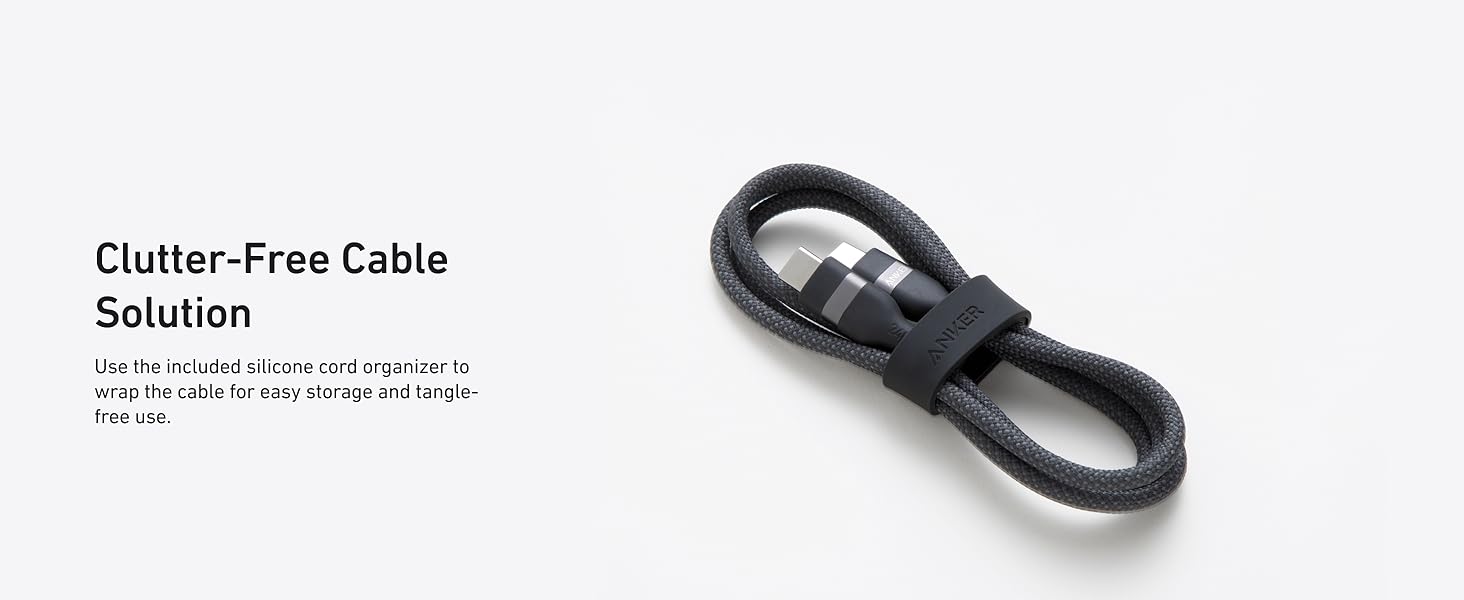• Lo que obtienes: cable Anker USB-C a USB-C (3 pies, 240 W, trenzado reciclado), organizador de cables de silicona, guía de bienvenida (idioma español no garantizado).