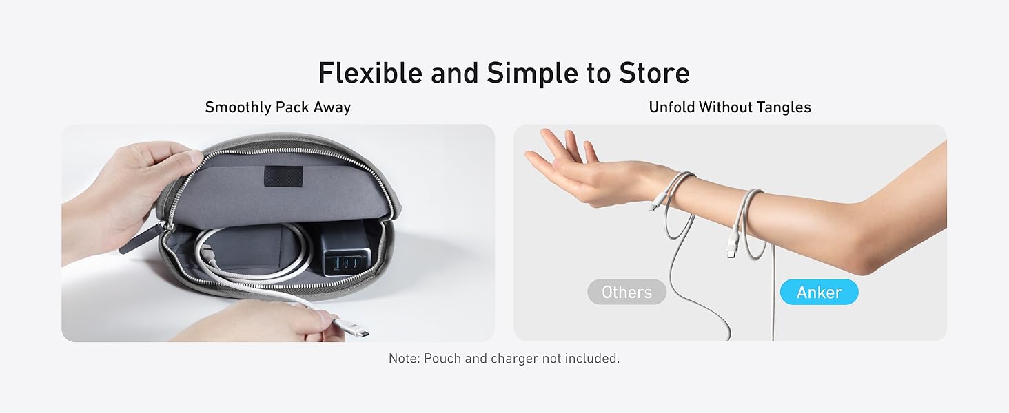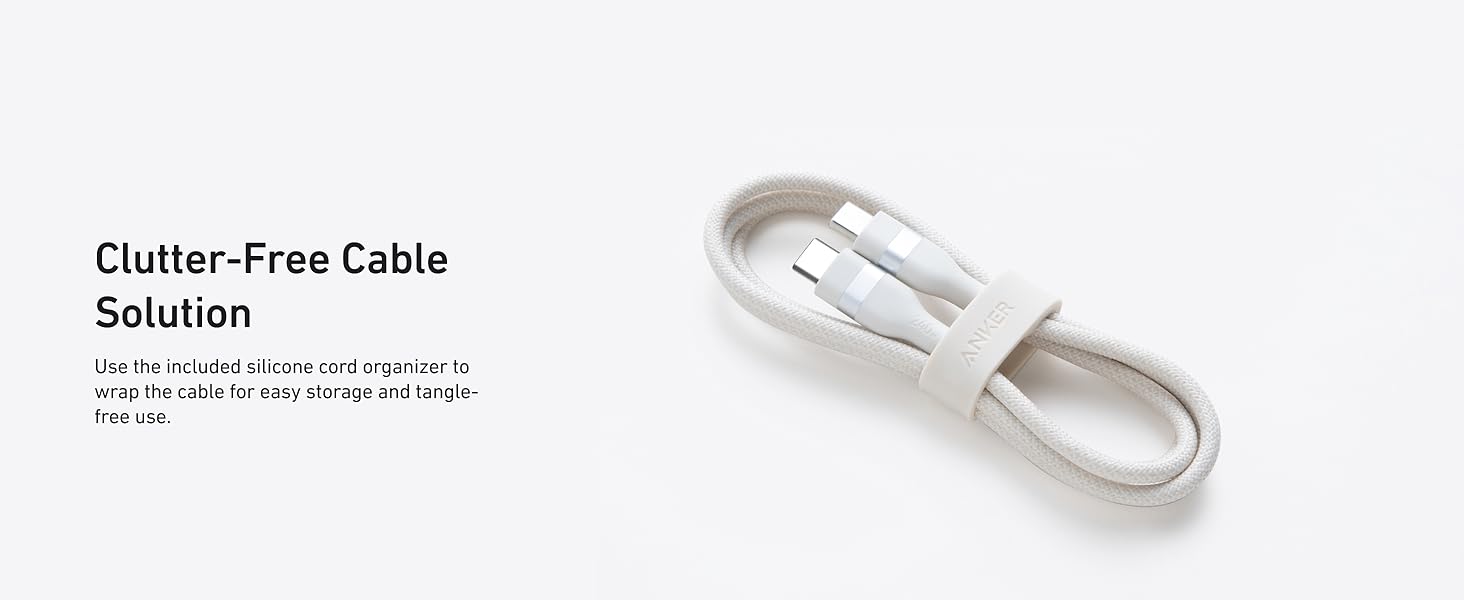 • Lo que obtienes: cable Anker USB-C a USB-C (6 pies, 240 W, trenzado reciclado), organizador de cables de silicona, guía de bienvenida (idioma español no garantizado).