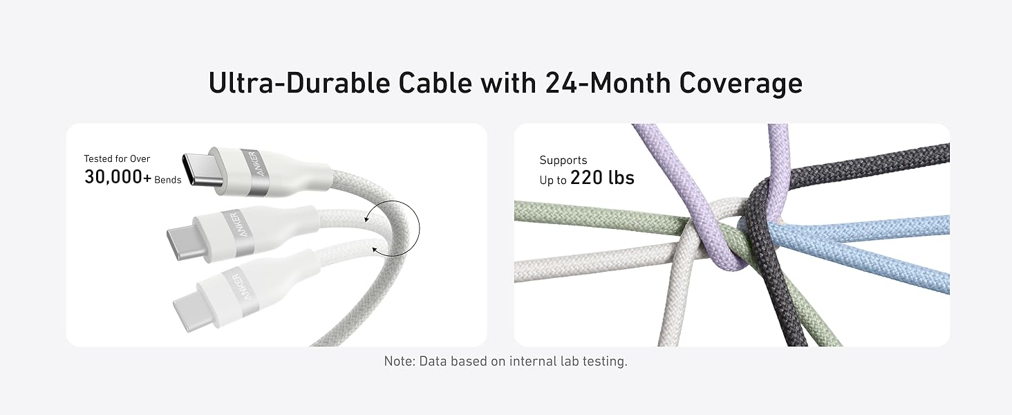 • Cable de carga ultraduradero: con una vida útil de más de 30,000 curvas y la capacidad de soportar 220 libras sin romperse, este cable está construido para durar más de 10 años.