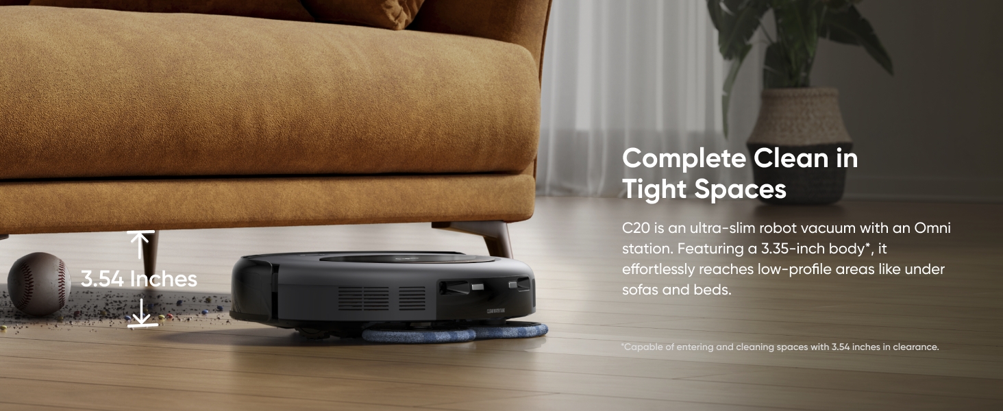 • Diseño de 3.35 pulgadas: su diseño de 3.35 pulgadas permite que el C20 llegue a espacios reducidos, como debajo de escritorios y camas, asegurando una limpieza completa en áreas de difícil acceso y reduciendo la limpieza manual en espacios de muebles de perfil bajo.