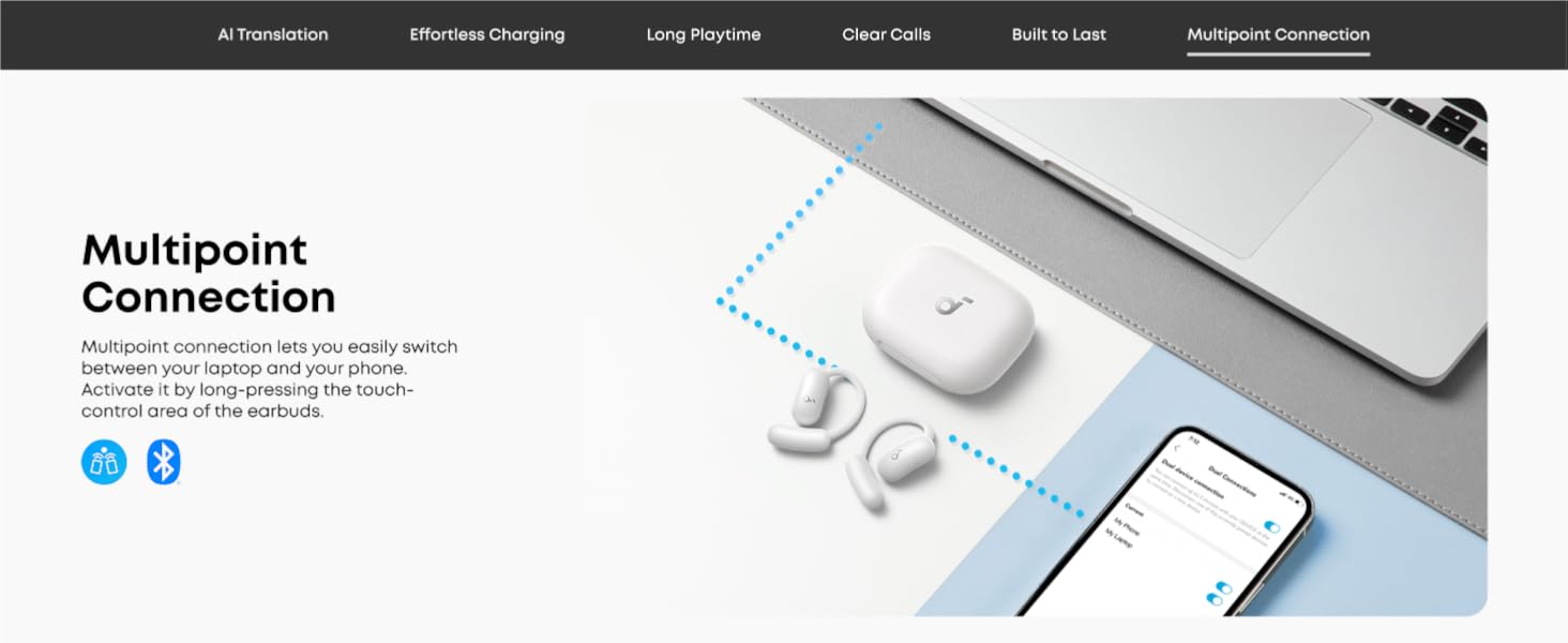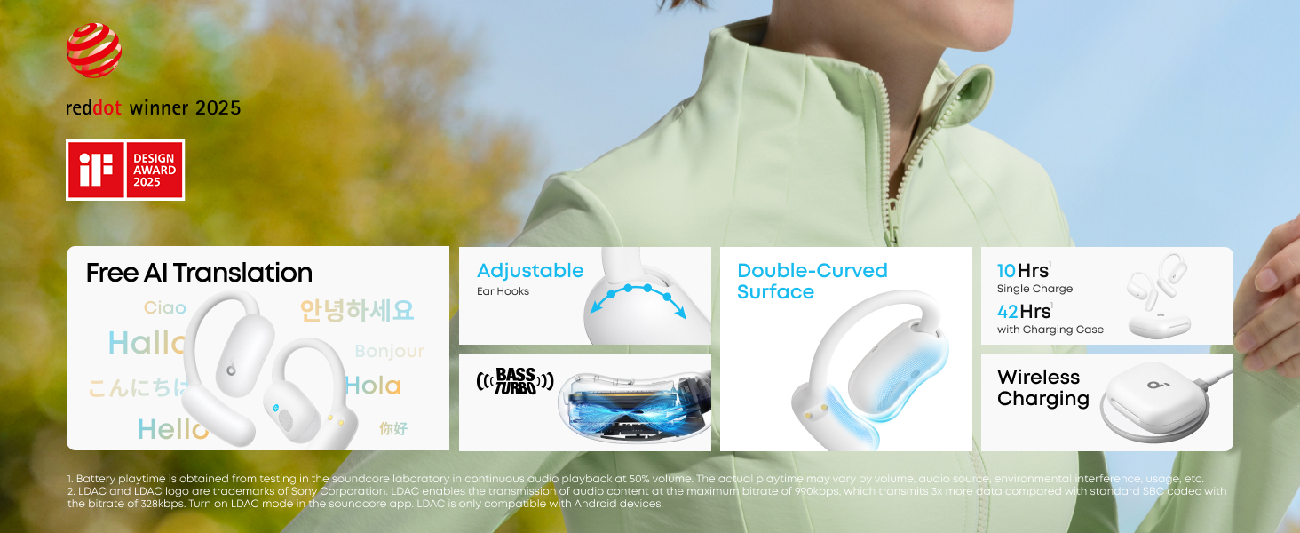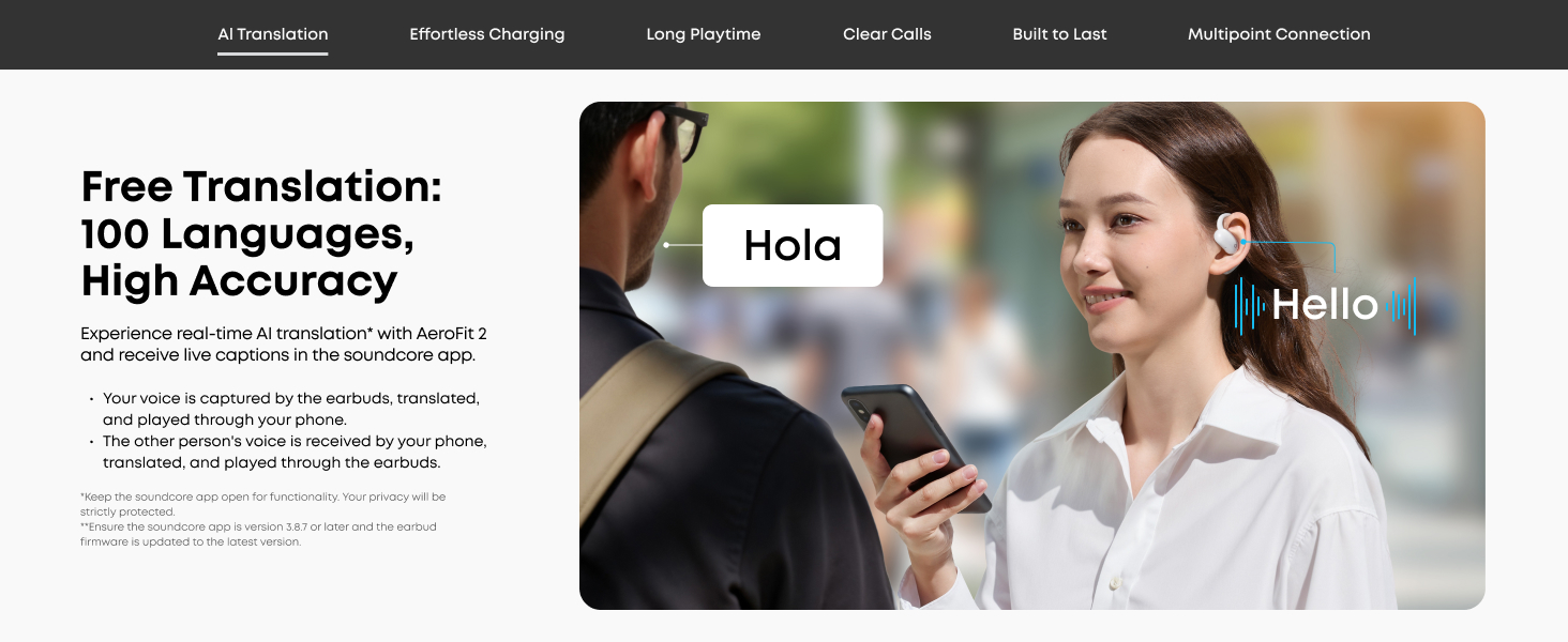 • Traducción Al gratuita: Admite 100 idiomas con respuesta en tiempo real y alta precisión. Desde vacaciones tropicales hasta conferencias globales, manténgase informado dondequiera que la vida lo lleve. Nota: Asegúrate de que la aplicación Soundcore sea la versión 3.8.7 o posterior y que el firmware del auricular esté actualizado a la última versión.