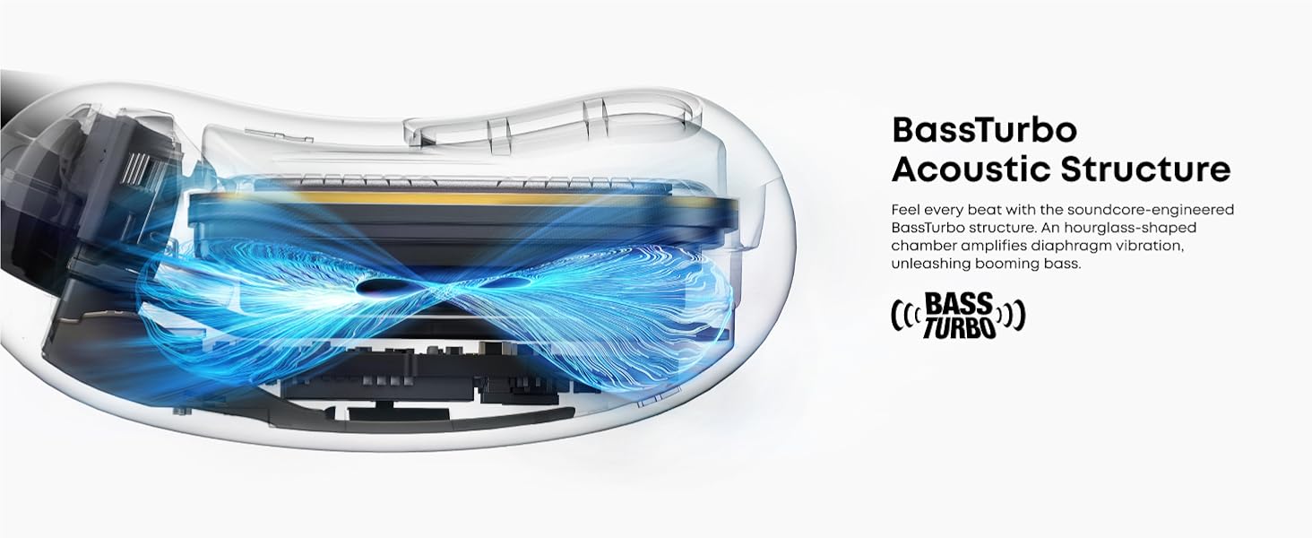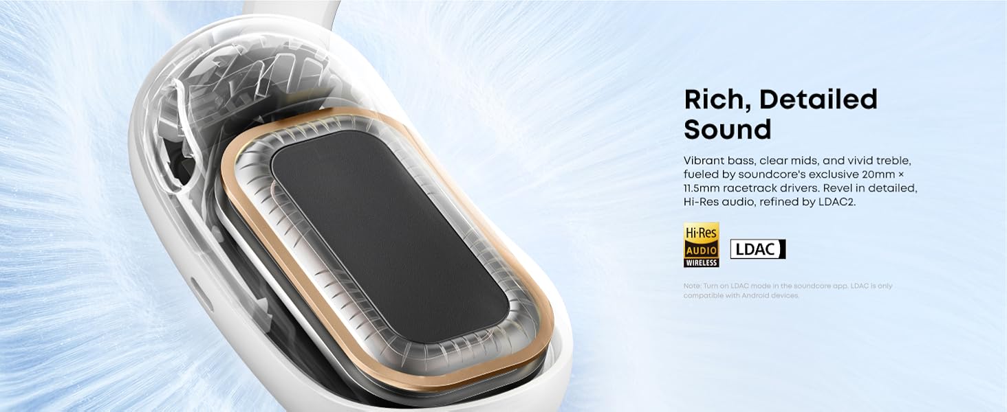 • Sonido rico: disfruta de graves profundos, medios claros y agudos vívidos, impulsados por conductores de pista de carreras de 0.787 in × 0.453 in y acústica BassTurbo. También es compatible con Bluetooth 5.4 y el códec LDAC para una transmisión de audio estable y de alta resolución.