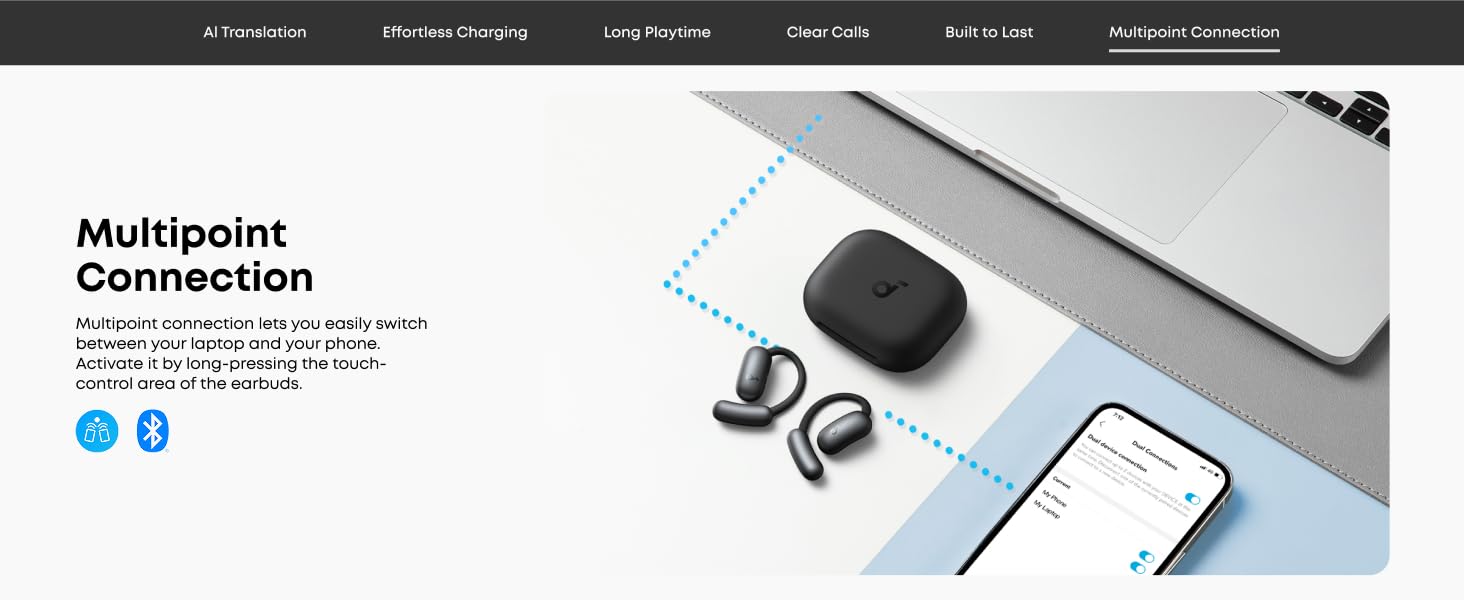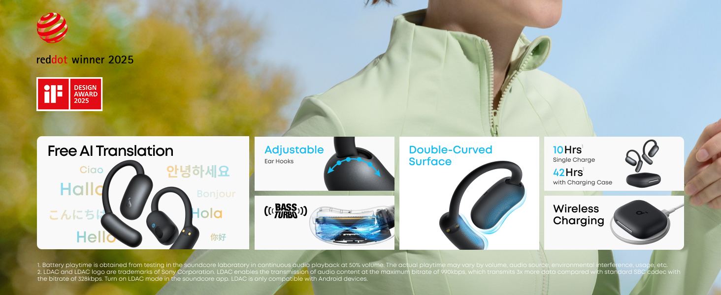 • Traducción Al gratuita: Admite 100 idiomas con respuesta en tiempo real y alta precisión. Desde vacaciones tropicales hasta conferencias globales, manténgase informado dondequiera que la vida lo lleve. Nota: Asegúrate de que la aplicación Soundcore sea la versión 3.8.7 o posterior y que el firmware del auricular esté actualizado a la última versión.