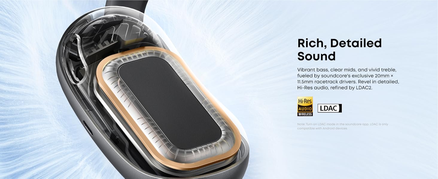 • Sonido rico: disfruta de graves profundos, medios claros y agudos vívidos, impulsados por conductores de pista de carreras de 0.787 in × 0.453 in y acústica BassTurbo. También es compatible con Bluetooth 5.4 y el códec LDAC para una transmisión de audio estable y de alta resolución.