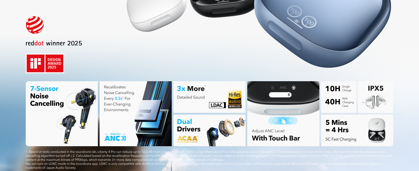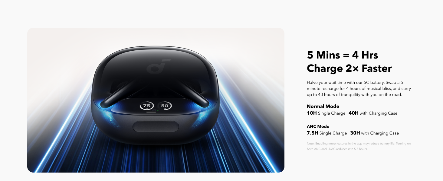 • Carga súper rápida: los auriculares con cancelación de ruido Liberty 4 Pro se cargan 2 veces más rápido que los modelos anteriores con la batería 5C. Una recarga de 5 minutos ofrece 4 horas de tiempo de juego. Disfruta de hasta 10 horas entre cargos, ampliable hasta 40 horas con la funda.