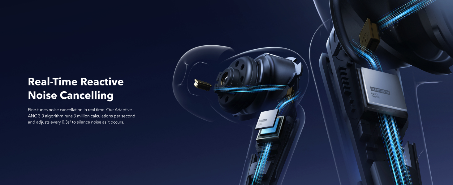 • Reducción de ruido adaptativa en tiempo real: estos auriculares inalámbricos con cancelación de ruido se adaptan a su entorno en constante cambio cada 0,3 segundos, asegurando una reducción de ruido óptima y sin interrupciones durante todo el día.