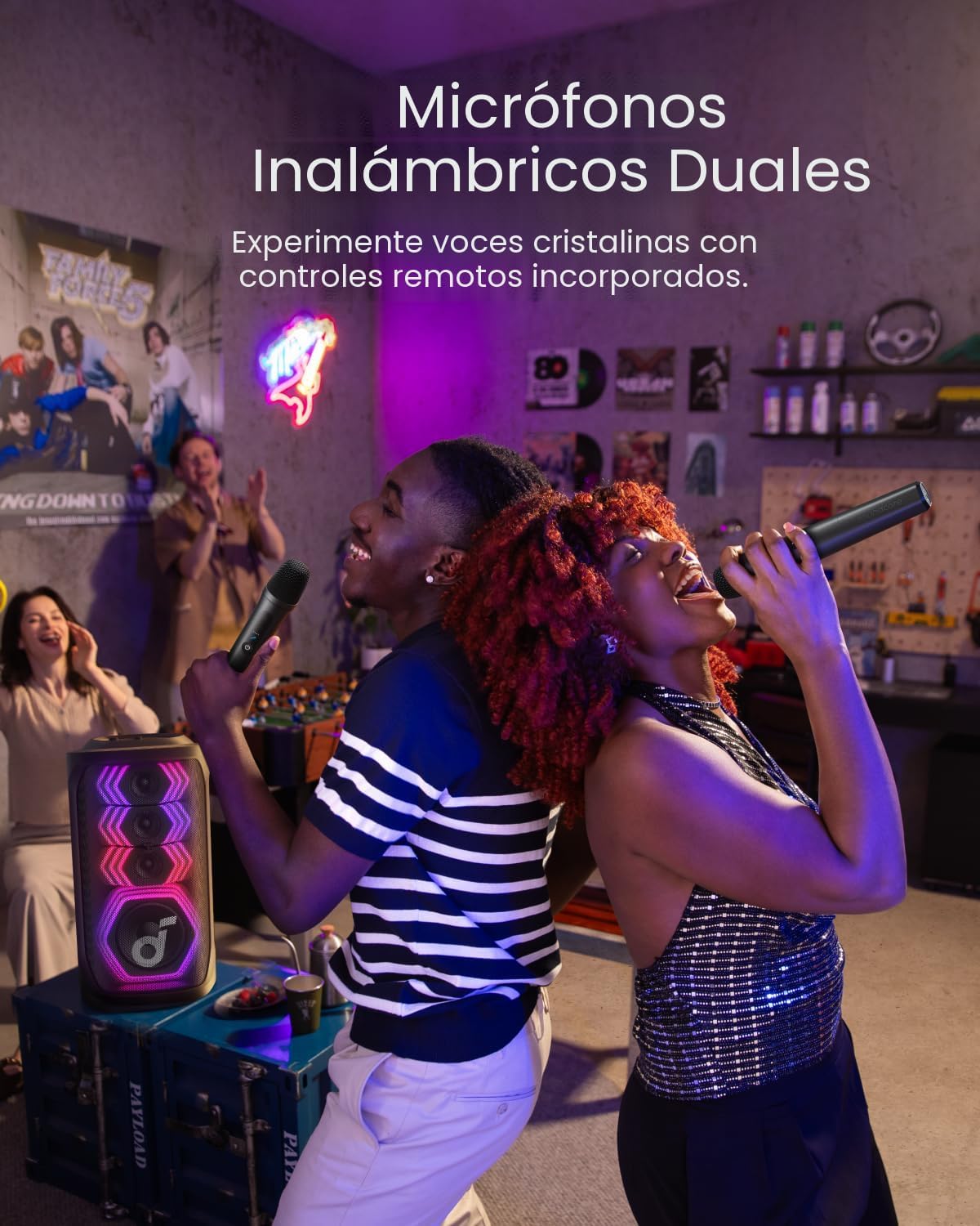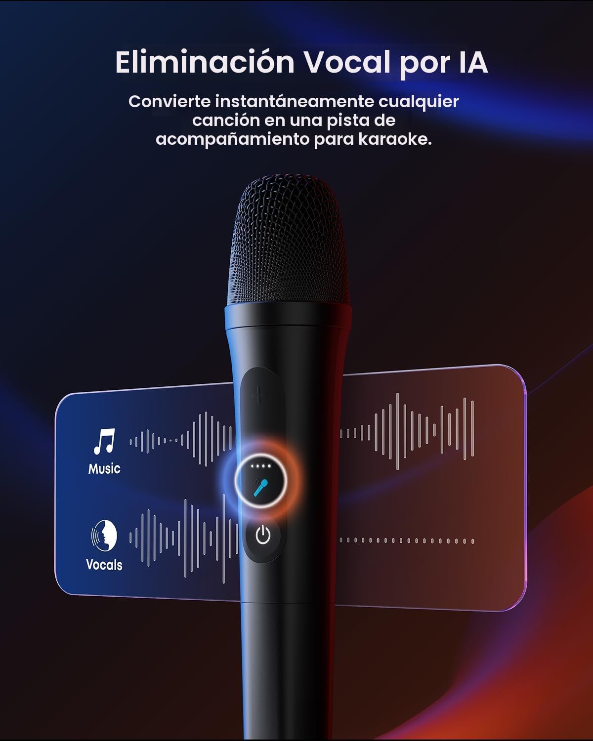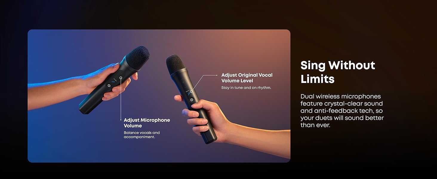 - Micrófonos inalámbricos duales: Domina cada dúo con voces nítidas y controles incorporados de volumen y eliminación de voz.